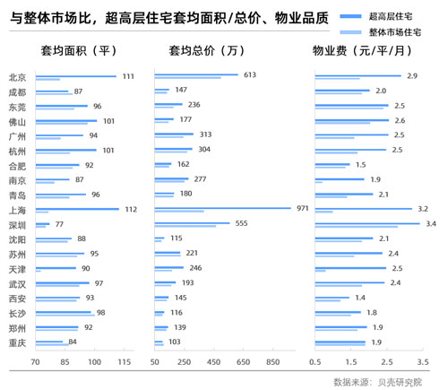 貝殼研究院數據顯示,超高層住宅通常具有中高端物業屬性,與整體市場相比,大部分城市超高層住宅具有凸出的優勢:更高的居住品質、更佳的地理位置。