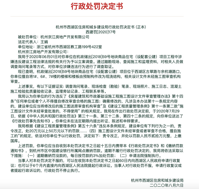 近期,據杭州市西湖區住房和城鄉建設局行政處罰決定書“西建罰[2020]17號”顯示,現已查明,杭州京江房地產開發有限公司在杭政儲出[2018]59號地塊商品住宅(設配套公建)項目位于西湖區古翠路與余杭塘路口,該單位擅自將1#、6#、7#樓的樓梯和樓板由預制構件改為現澆結構,相關設計文件未經施工圖審查機構審查,上述行為違反建設工程法律法規,根據《建設工程質量管理條例》第五十六條“違反本條例規定,建設單位有下列行為之一的,責令改正,處20萬元以上50萬元以下的罰款……(四)施工圖設計文件未經審查或者審查不合格,擅自施工的”的規定,依法對該單位予以行政處罰,杭州市西湖區住房和城鄉建設局決定責令其改正,并處以罰款人民幣20萬元,上繳國庫。
