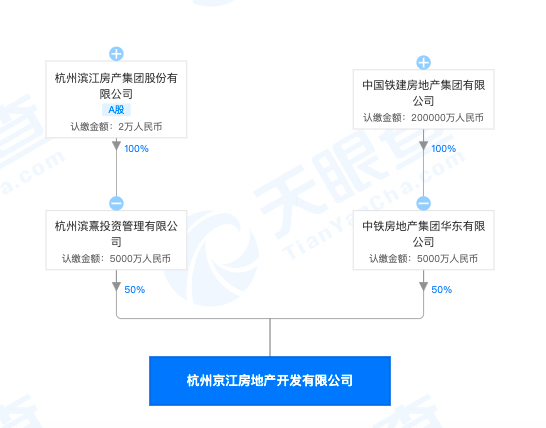 中華網財經從天眼查查詢了解到,透過穿透股權關系,杭州京江房地產開發有限公司是杭州濱江房產集團股份有限公司與中國鐵建房地產集團有限公司合資子公司。