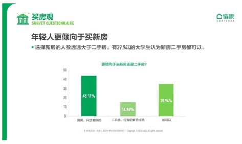 而在首套住房是選擇買新房還是二手房的問(wèn)題上,絕大多數(shù)人都選擇了新房。“報(bào)告”顯示,有45.11%的大學(xué)生選擇只考慮新房,39.94%的大學(xué)生認(rèn)為新房二手房都可以,而只選擇二手房的僅占比14.96%。