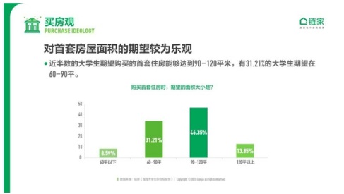 在面對(duì)未來(lái)的置業(yè)買房問(wèn)題上,初入社會(huì)的大學(xué)生們也顯得格外的樂(lè)觀,并呈現(xiàn)出對(duì)生活品質(zhì)的高要求,多數(shù)人期望能在30歲之前擁有首套房,其理想型住房具有“新房、面積較大”等特征。