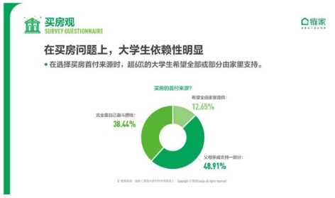 但是,與此同時(shí),報(bào)告顯示,大多數(shù)大學(xué)生對(duì)于置業(yè)問(wèn)題還基本停留在理想狀態(tài),在涉及到敏感的金錢等問(wèn)題時(shí),接受調(diào)研的大學(xué)生們表現(xiàn)出了明顯的依賴性,有超過(guò)60%的大學(xué)生希望全部或部分由家里支持首付,有44.73%的人則表示,只可以接受占收入比例10%-30%以內(nèi)的貸款月供。