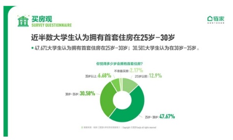 報(bào)告顯示,在何時(shí)擁有首套住房這個(gè)問(wèn)題上,接近半數(shù)的大學(xué)生認(rèn)為應(yīng)該在30歲之前,有47.67%的人選擇了25-30歲這個(gè)選項(xiàng),30.58%選擇了30-35歲。