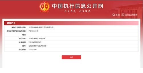 近日,據(jù)中國執(zhí)行信息公開網(wǎng)顯示,京津冀地產(chǎn)巨頭鴻坤地產(chǎn)被列為“被執(zhí)行人”,案號為(2020)京0112執(zhí)7463號,執(zhí)行標(biāo)的為55821899元,執(zhí)行法院為北京市通州區(qū)人民法院。