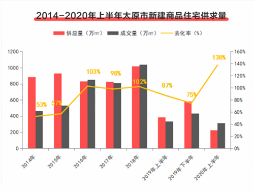 據樓查查統計數據顯示,2020年上半年太原市新建住宅出現了供應面積、成交面積、銷售套數均同比下降情況,但太原新建商品住宅去化率卻達到138%,環比上漲63個百分點;同比上漲51個百分點。新建商品住宅銷售均價11176元/平方米,環比下降1%;同比下降2%。