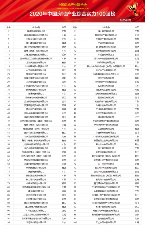 近日,2020年中國房地產(chǎn)業(yè)綜合實(shí)力100強(qiáng)排行榜發(fā)布,這是中國房地產(chǎn)業(yè)聯(lián)合會(huì)對房地產(chǎn)行業(yè)進(jìn)行全面、科學(xué)、獨(dú)立的企業(yè)實(shí)力發(fā)展調(diào)查研究宣傳發(fā)布工作。通過對全國34個(gè)省(區(qū)、市)超過3000家利潤總額在8000萬元至620億元之間的中國房地產(chǎn)開發(fā)企業(yè)進(jìn)行了數(shù)據(jù)采集研究,比照國際上通行的做法,主要根據(jù)營業(yè)收入、資產(chǎn)總額、利潤總額、資信等級、社會(huì)貢獻(xiàn)、業(yè)主滿意度等指標(biāo)分析確定候選企業(yè),邀請100位企業(yè)高管、學(xué)者及官員對經(jīng)資格審核符合要求的企業(yè)進(jìn)行綜合評分,并對部分候選企業(yè)進(jìn)行實(shí)地拜訪,從中遴選出100家中國房地產(chǎn)業(yè)綜合實(shí)力100強(qiáng)企業(yè)。在此基礎(chǔ)上通過與世界500強(qiáng)企業(yè)進(jìn)行綜合對比分析,進(jìn)而有針對性地提出促進(jìn)中國房企做強(qiáng)做大做久的策略建議,在全國范圍內(nèi)形成了巨大的社會(huì)影響力。