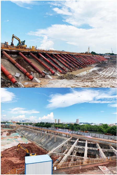 鑒于此,君豪項(xiàng)目部嚴(yán)格按照設(shè)計(jì)支護(hù)形式采用灌注樁+角撐/拋撐支護(hù),外圍三軸水泥攪拌樁止水帷幕,被動(dòng)區(qū)單軸水泥攪拌樁加固,及旋挖支護(hù)形式的可靠施工方案。其中13m跨度火箭頭式鋼拋撐支撐,在反壓土臺(tái)開挖后起到了支撐基坑整體,保證其安全穩(wěn)定性的作用,該工藝的法蘭連接拋撐,工藝簡(jiǎn)易,施工便捷,且在地下室施工完畢后,鋼拋撐還能拆除,重復(fù)利用,確保了項(xiàng)目施工的安全有序、環(huán)保降本、品質(zhì)高效。