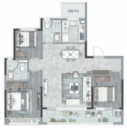 中間是餐客一體的公區(qū),南北通透,在盡可能控制面積的同時,很好地兼顧了舒適尺度,殊為不易。相比其它120㎡左右的戶型,景粼玖序這個戶型還有一個特點是8.1m的超寬觀景陽臺設(shè)計,這是許多150平方米大戶型住宅都不曾有的奢配。
