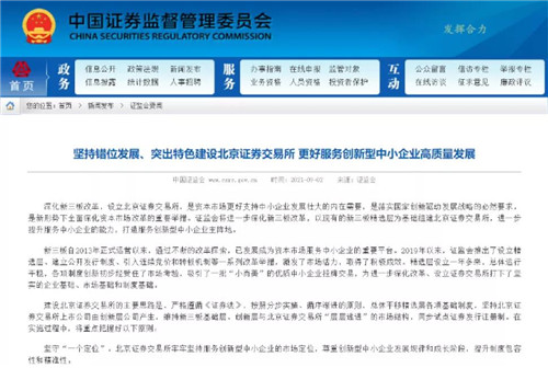 隨后,證監會官方網站發布《堅持錯位發展、突出特色建設北京證券交易所 更好服務創新型中小企業高質量發展》文章,文中提到:北京證券交易所牢牢堅持服務創新型中小企業的市場定位,尊重創新型中小企業發展規律和成長階段,提升制度包容性和精準性。