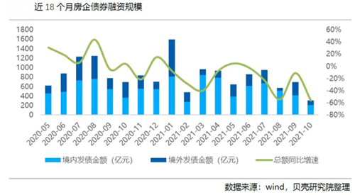 貝殼研究院統計顯示,今年1-10月房企境內外債券融資累計約7993億元,較2020年同期下降24%,金額規模減少2463億元;其中境外發債折合人民幣約2471億元,同比下降約37.4%。境外融資規模占比維持31%左右的低水平。