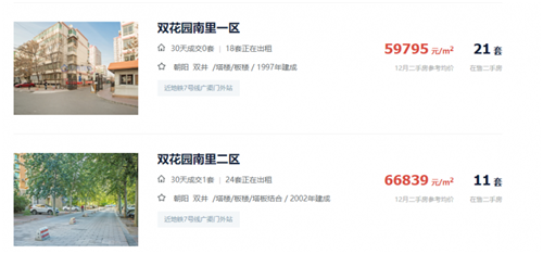 貝殼找房顯示,該小區12月二手房均價為66839元/㎡,而雙花園南里一區12月二手房均價為59795元/㎡。