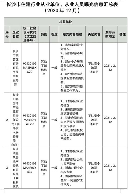 此外,被曝光的企業還包長沙市芙蓉區有房有家房屋中介服務部、長沙柒壹玖房地產經紀有限公司(我愛我家凱通國際城店)、湖南金基置業有限公司、長沙科寓房地產經紀有限責任公司一分公司等5家。