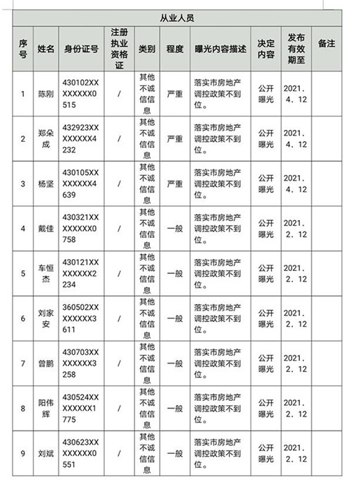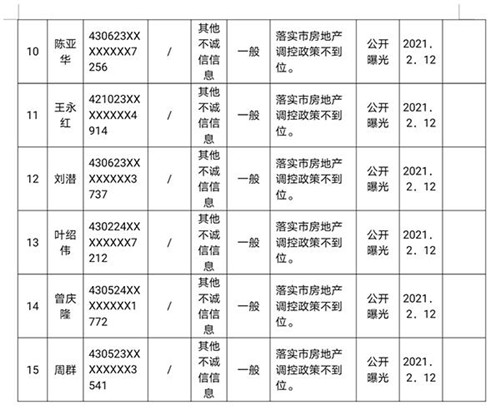 15名企業責任人均因“落實市房地產調控政策不到位”而被曝光,包括陳剛、鄭朵成、楊堅、戴佳、車恒杰、劉家安、曾鵬、陽偉輝、劉斌、陳亞華、王永紅、劉潛、葉紹偉、曾慶隆和周群。