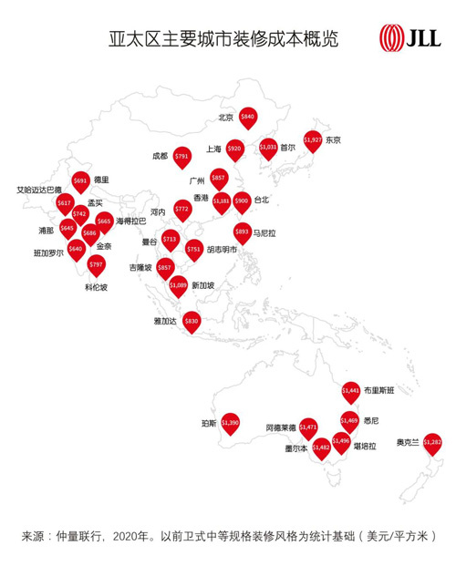 同時,在奧克蘭、曼谷、馬尼拉、首爾及臺北等城市,由于眾多建筑服務提供商和承包商選擇壓縮整體利潤,這些城市的裝修成本或將維持穩定,甚至略有下滑。
