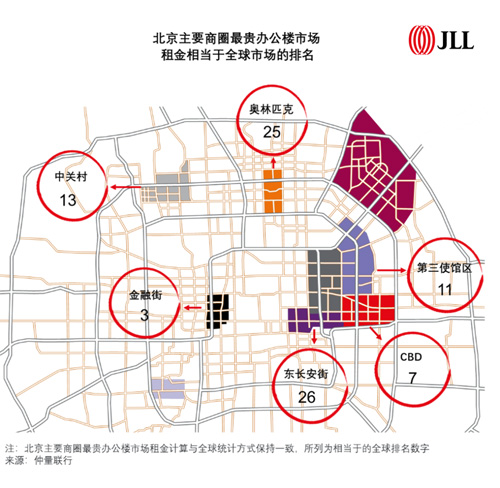 香港中環連續五年領跑全球優質辦公樓租金,位居榜首;北京金融街仍位列第三,但與第一名租金差距縮小63%,北京中央商務區從去年的第九名上升至第七名。前20名中,上海浦東上升一名,上海浦西重回前20,北京中關村首次入榜即位列13。