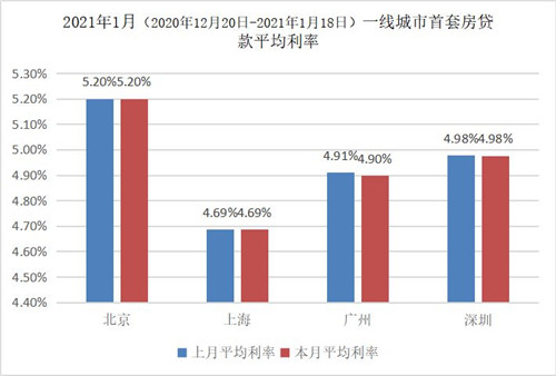 根據融360大數據研究院對全國41個重點城市674家銀行分支機構房貸利率的監測數據,2021年1月(數據監測期為2020年12月20日-2021年1月18日),全國首套房貸款平均利率為5.22%,二套房貸款平均利率為5.53%,均環比下降1BP。