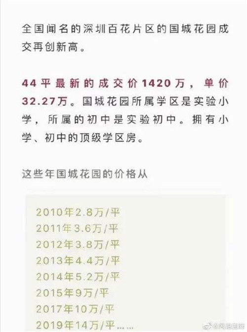 上周末,《證券時報》報道稱,有消息稱深圳福田百花片區的國城花園,44平方米房源成交價格達到1420萬元,折合每平方米32.27萬元。由于該小區自帶深圳實驗小學和實驗中學兩個優質學位,多年來,備受家長和投資客追捧。鏈家APP顯示,該小區建成年代1995至1998年,樓齡已超過20年。該消息引爆全國人民的熱議。有網友表示,在幾年前,有人預言,深圳灣的房價將在幾年內漲到三十萬一平,當時,大部分人都是不相信的,但現在,不僅深圳灣漲到了三十萬一平米,就連老破舊也漲到了三十多萬一平米。