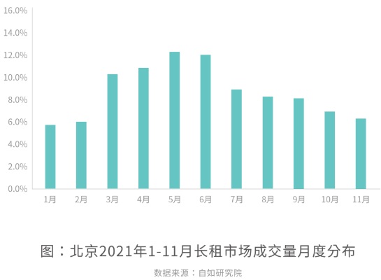 2021年北京住房租賃市場(chǎng)全年淡旺季明顯,同時(shí)長(zhǎng)租機(jī)構(gòu)房源租金價(jià)格平穩(wěn),呈現(xiàn)“量變價(jià)穩(wěn)”特征。