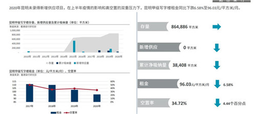 在“2020年昆明房地產市場回顧報告”中,昆明甲級寫字樓市場無新增供應,全市存量維持在864886平方米。一方面,在高空置和疫情的雙重影響下,業主為提升入住率,采取以價換量措施導致昆明甲級寫字樓租金在2020年同比下滑6.58%至96.03元平方米月。另一方,租金的下滑為非甲級寫字樓租戶提升辦公品質提供了契機,租戶置換辦公空間需求明顯提升,推動全市空置率同比下降。