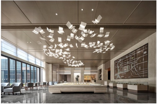 空間整體以透亮肌理的原木色大理石磚奠定空間基調,沙盤區則以更大體量的表達作為場景的焦點。高低錯落的燈飾是另一種形式的詩意敘事。像翻動的書頁滲出智者的閃光,也像夢想的翅膀,致敬每一位對生活充滿熱愛的人,將希望源源不斷地向更廣闊的世代涌動。