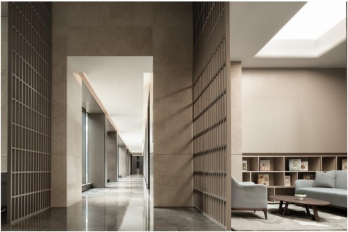 既敞開了迎接,便不主張設置過多屏障,僅以中式格柵稍稍隔擋,隱秘而不閉塞。兩旁長廊作為承接室內外各個空間的橋梁,一貫延續了大空間的材料選擇,并融入深色木飾面、質感墻紙等額外巧思,使其具備連接性;又以強烈的序列感一字鋪排開,形成它的獨立性。