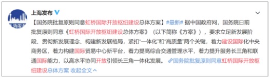 2021年2月18日,國務院發布關于同意《虹橋國際開放樞紐建設總體方案》的批復,引爆微博: