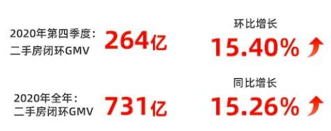 本季度,房多多的二手房業務邁入全新臺階,交易閉環能力顯著提升。財報顯示,2020年第四季度,房多多二手房閉環GMV為264億,環比增長15.4%。2020年,平臺二手房累計閉環GMV為731億,同比增長15.26%。
