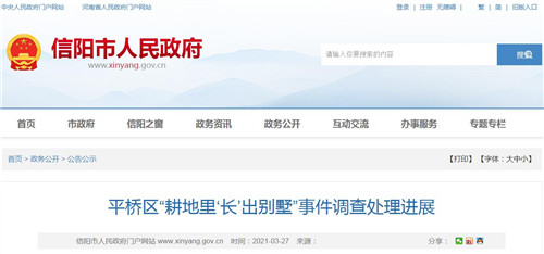 房訊網(wǎng)訊 3月27日,河南信陽市人民政府官網(wǎng)發(fā)布《平橋區(qū)“耕地里‘長’出別墅”事件調(diào)查處理進展》,針對央視《經(jīng)濟半小時》欄目反映的信陽市平橋區(qū)違法占用耕地建房問題,信陽市高度重視,立即成立了由市紀委監(jiān)委、市自然資源規(guī)劃局、市公安局、市農(nóng)業(yè)農(nóng)村局等部門組成的聯(lián)合調(diào)查組,迅速開展調(diào)查,對違法占地建房將堅決進行拆除,對涉及的違法違規(guī)違紀相關(guān)單位和責任人依法依紀嚴肅問責。