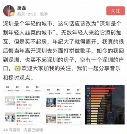 就連歌手唐磊都吐槽深圳房?jī)r(jià),還上了熱搜:“我真的很后悔當(dāng)年離開(kāi)深圳去外面打拼做歌手,如今的我回到深圳也買(mǎi)不起深圳的房子,空有一個(gè)深圳戶(hù)口!