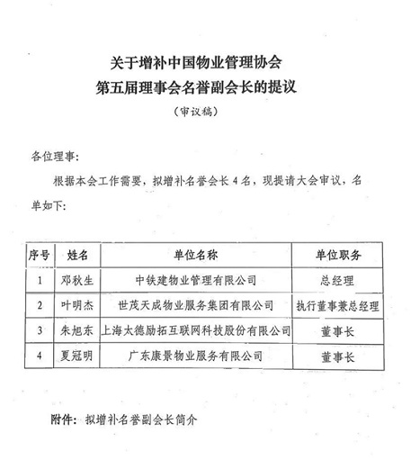 值得一提的是,世茂天成物業服務集團有限公司執行董事兼總經理葉明杰增補成為第五屆理事會名譽副會長。