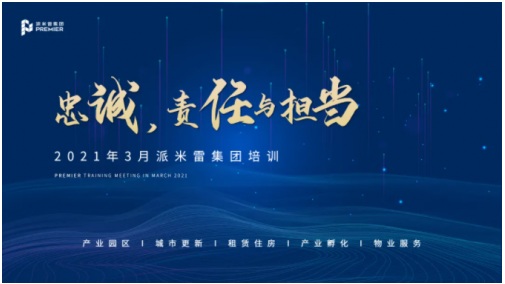 進一步強化集團員工理想信念,提升綜合素質,凝聚派米雷集團全體員工眾志成城的磅礴力量。2021年3月19日,由集團綜合管理中心牽頭組織《忠誠、責任和擔當》的企業文化培訓,在位于上海市松江區樂都路262號派米雷·樂都隆重舉行。來自集團各職能中心、產業園區、城市更新、租賃住房等業務板塊的全體同仁準時參加此次培訓。