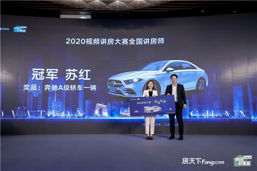 房天下集團(tuán)總裁董詩(shī)航為"2020視頻講房大賽全國(guó)冠軍講房師"蘇紅頒發(fā)了超級(jí)大獎(jiǎng)--奔馳A級(jí)轎車一輛。
