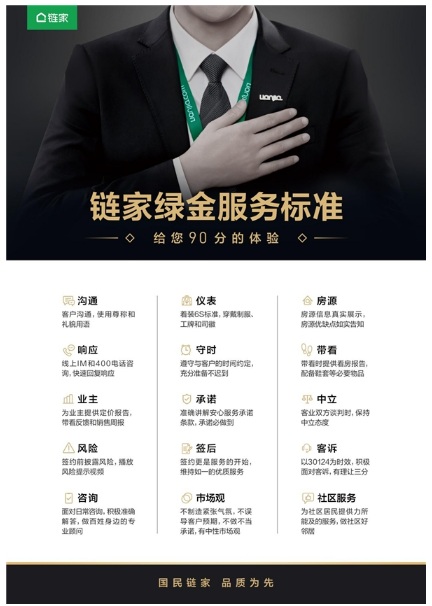 為此,鏈家發布規范房產經紀服務的“綠金服務標準”。鏈家全國品牌負責人蔡濤表示:“基于多年的行業經驗和客戶洞察,并結合內部各項現有的管理要求和客戶實際需求,鏈家總結提煉出15條服務標準,覆蓋了房產經紀行業服務的關鍵觸點。包括客戶溝通和儀容儀表相關的職業形象,線上響應、客戶帶看、業主維護、服務承諾、簽后服務、斡旋談判、客訴處理等比較核心的服務觸點,并要求經紀人保持中性的市場觀以及為社區居民提供力所能及的服務。”