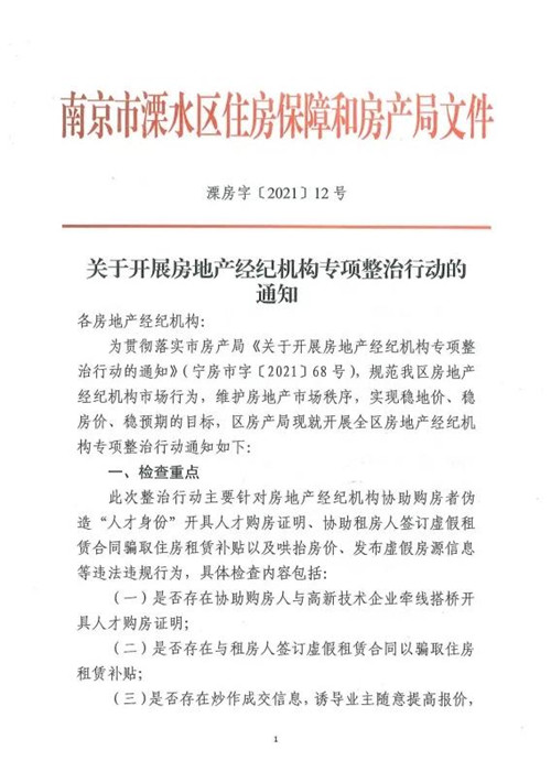 房訊網訊 近日,針對中介惡意炒作房價、經紀機構違規經營、違規開具有關證明、提供虛假租賃合同等房地產市場亂象,南京市溧水區發布《關于開展房地產經紀機構專項整治行動的通知》,開展專項整治行動,嚴厲打擊這些亂象。