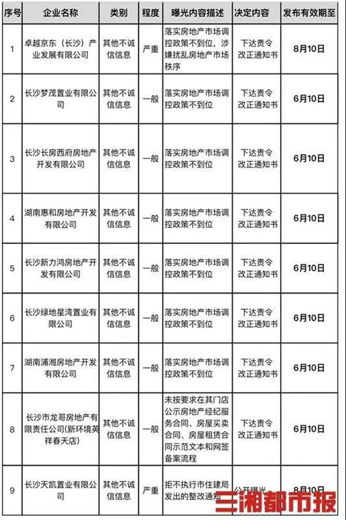 5月11日,長沙市住建局曝光了4月第二批住建行業從業企業不誠信行為。其中,卓越、新力、綠地等7家企業因落實房地產市場調控政策不到位被曝光。針對不同的不誠信行為,長沙市住建局已經下達了責令改正通知書,并進行公開曝光。
