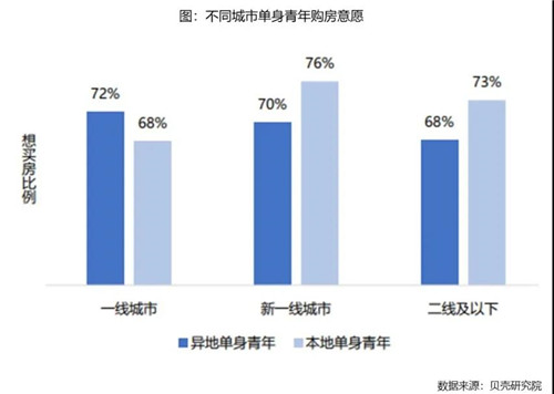 異地漂泊的大城市單身青年對“家”的慰藉更為渴求。根據調研,近六成一線城市單身青年和近半數新一線城市單身青年來自異鄉,他們中想要買房的占比超過70%,高于二線及以下城市。而本地青年的購房意愿受到現實因素和實用價值等多方面影響,新一線城市的本地單身青年置業愿望最高,占比達到76%。