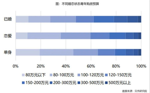 支撐青年購房夢的,是“多個荷包”。《報告》指出,73.19%的單身青年受訪者購房資金中有自有存款,60.86%有家人支持,高于戀愛或已婚狀態的青年群體。與已婚青年相比,單身青年的購房實力稍遜,購房預算在百萬元以上的單身、婚戀、已婚占比分別為54.01%、64.14%和72.50%。