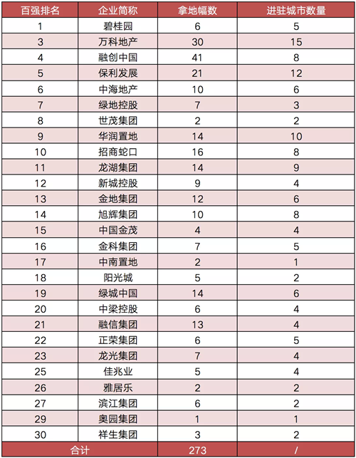 CRIC數據顯示,TOP30房企在20個城市中共拿下273幅含住宅的地塊,占全部地塊的比重超四成。具體到房企而言,頭部房企表現尤為突出。其中,融創拿地總量已達到41幅,萬科和保利拿地總量也均超過20幅。而30強中排名靠后的房企拿地數量多為個位數。