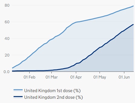 英國(guó)疫苗接種計(jì)劃正在快速有序地推進(jìn),英國(guó)政府公布的數(shù)據(jù)顯示,截至6月15日,全英已經(jīng)有超過(guò)4,169萬(wàn)人(占成年人口的79.2%)注射了第一針新冠疫苗,超過(guò)2,997萬(wàn)人(占成年人口的56.9%)兩針疫苗全部完成。疫苗接種計(jì)劃和疫情應(yīng)對(duì)舉措的成功,讓英國(guó)的全面解封計(jì)劃前景變得更加樂(lè)觀。如無(wú)意外,英國(guó)民眾有望在7月19日迎來(lái)全面解除防疫措施的好日子。