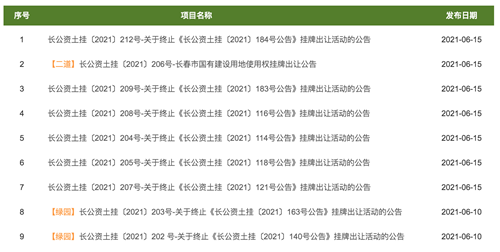 6月15日,吉林省長春市公共資源交易網公告顯示,原定于近期出讓的6宗涉宅用地終止地塊掛牌出讓活動。據悉,6宗涉宅地塊分別位于長春新區(北湖科技開發區)、空港經濟開發區和二道區。