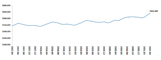 報告顯示,截止到2021年4月底,美國房屋庫存量約為116萬套,同比降低20.5%,按當前的銷售速度,庫存去化時間約為2.4個月,接近歷史最低庫存去化時間。由于房屋供應持續短缺,2021年4月全美房屋銷售量較3月有所降低,但住房需求仍然強勁,未來整體市場房價有望持續攀高。