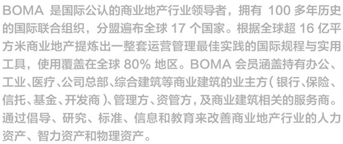 商業(yè)地產(chǎn)可持續(xù)發(fā)展不只是節(jié)能,還包括建筑健康、環(huán)保,是從建造到運(yùn)營的長期的工作,需要培訓(xùn)人才專業(yè)能力,發(fā)揮建筑硬件運(yùn)營效率與品質(zhì)。業(yè)主方、租戶的推動(dòng)與支持能夠?yàn)楣芾矸健⒎⻊?wù)商改革帶來更多動(dòng)力。BOMA作為商業(yè)地產(chǎn)協(xié)會(huì)能夠?yàn)樾袠I(yè)可持續(xù)發(fā)展提供專業(yè)資源與管理框架支持,滿足資產(chǎn)增值與社會(huì)可持續(xù)發(fā)展的雙重需求。