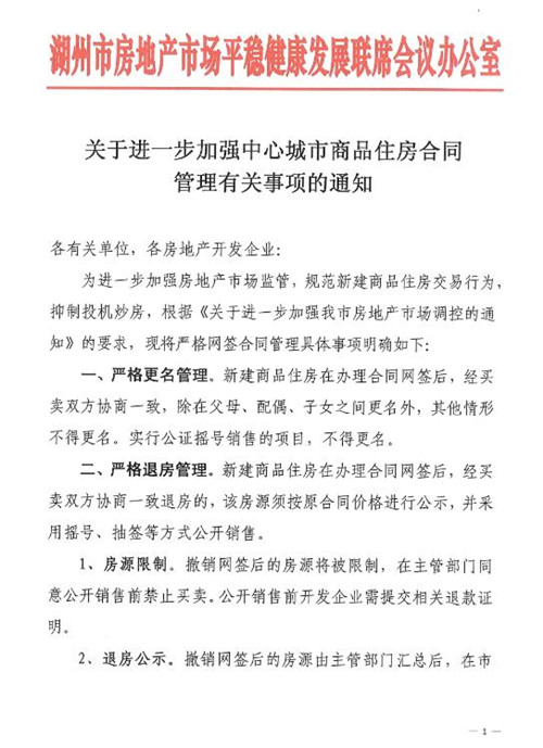 房訊網(wǎng)訊 6月4日,浙江省湖州市住房和城鄉(xiāng)建設(shè)局發(fā)布《關(guān)于進(jìn)一步加強(qiáng)中心城市商品住房合同管理有關(guān)事項(xiàng)的通知》。《通知》明確,新建商品住房在辦理合同網(wǎng)簽后,經(jīng)買賣雙方協(xié)商一致,除在父母、配偶、子女之間更名外,其他情形不得更名。實(shí)行公證搖號(hào)銷售的項(xiàng)目,不得更名。