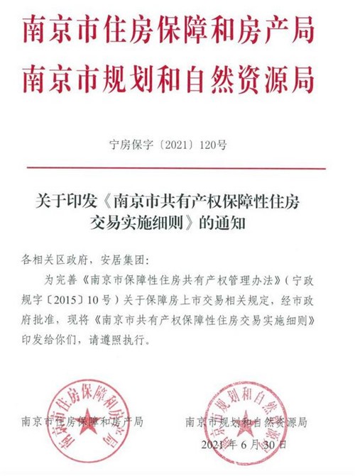 房訊網(wǎng)訊 近日,南京市住房保障和房產(chǎn)局、南京市規(guī)劃和自然資源局聯(lián)合印發(fā)《南京市共有產(chǎn)權(quán)保障性住房交易實(shí)施細(xì)則》,共有產(chǎn)權(quán)保障性住房自首次購(gòu)房發(fā)票記載時(shí)間起滿五年,符合相關(guān)條件的可買賣,買賣的住房不再作為共有產(chǎn)權(quán)保障性住房。