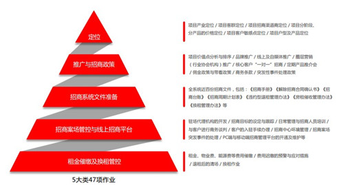 坪效優化通過運營管理升級和物業管理升級實現。運營中,大多數問題都源于"粗放"。例如疫情期間,很多企業需要免租或租金分期,如果是粗放的做法,"一刀切",沒有免租或者沒有租金分期,這就會造成客戶的流失。所以運營中不能忽略很多精細化的細節,木棉中國總結了運營過程中5大類47項作業,對每一項都有細致的規范化的把握,有時甚至會精細到分析每一個客戶,哪一類客戶怎么服務等。