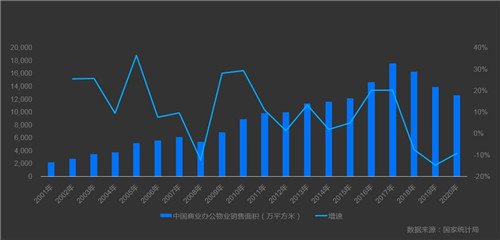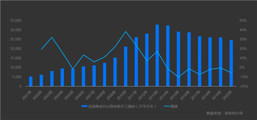 從數據來看,全國商業辦公物業總的新開工面積在2013年到達頂峰,之后連續7年都是負增長;從銷售的情況來看同樣如此,商業辦公物業銷售面積在2017年達到高峰是,之后連續3、4年時間一直處于下降的態勢。這是商業辦公物業總體在增量市場里表現出來的情況。