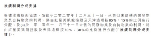 根據遠洋公告,截止2020年12月31日,紅星地產已售但未結轉的開發物業及自持物業的利潤,將由紅星美凱龍控股與天津遠璞按照85%:15%的比例進行分配;截止2020年12月31日,未售的開發物業及自持物業的利潤,將由紅星美凱龍控股和天津遠璞按70%:30%的比例進行分配。