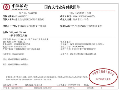 房訊網訊 7月21日,建業集團向鄭州市紅十字會捐贈現金500萬元設立“建業防汛抗災專項基金”,并同時采購救援物資支持受災地區與群眾。