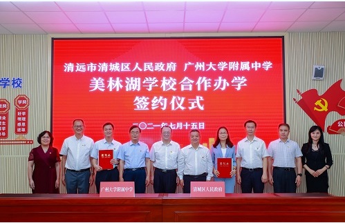 為加快廣清一體化高質量發展,促進國家城鄉融合發展試驗區廣清接合片區教育水平上新臺階,2021年7月15日上午,清遠市清城區人民政府與廣州大學附屬中學合辦美林湖學校舉行美林湖學校合作辦學簽約儀式,按下廣清基礎教育幫扶“快進鍵”。清遠市委市政府、清城區委區政府、廣州對口幫扶清遠指揮部、廣州大學及廣州大學附屬中學相關領導出席簽約儀式。