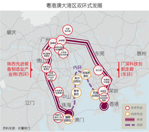 具體而言,上述軸帶式發展有效串連極點間的重要節點城市,并促成“外環”的形成,即廣深科技創新走廊(“東環”)和珠西先進裝備制造產業帶(“西環”);以及圍繞廣州南沙、深圳前海、珠海橫琴、東莞濱海灣新區和中山翠亨新區這五個關鍵的現代制造業節點,沿地理走向連接成一條半環形的“內環”發展軸帶。